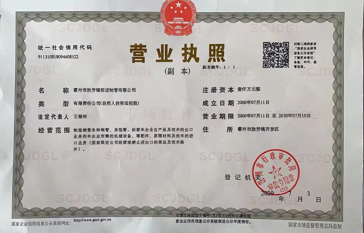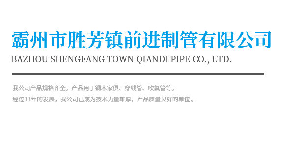 Bazhou Shengfang Town Qiandi Pipe Co., Ltd. 霸州市勝芳鎮(zhèn)前進(jìn)制管有限公司位于河北霸州市勝芳鎮(zhèn)開(kāi)發(fā)區(qū),地處京、津、保三大城市中心地帶。北距北京120公里,東距天津45公里,西有京九鐵路,北有津保高速公路貫通。規(guī)格齊全,檢測(cè)完備